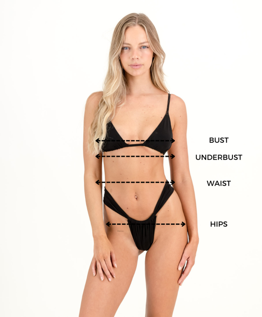 3. Now check your results against our size chart. We recommend sizing up if you are between sizes. If the bikini is adjustable (has ties on the side of the hips or around the bust) your choice should be made on the amount of coverage you would like. If you are in need of assistance, please message @leahmarieswim on instagram or send us an email on leahmarieswim@gmail.com